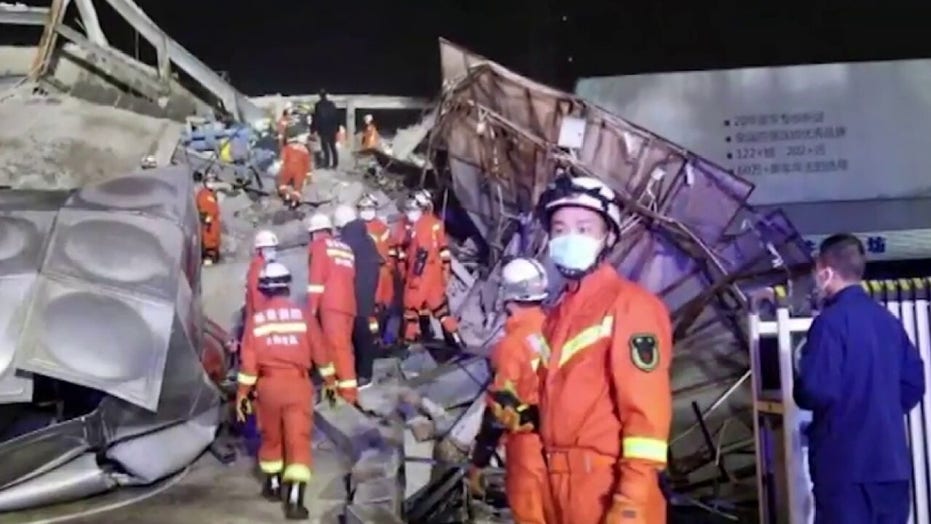 In this photo released by Xinhua News Agency, rescuers search for victims at the site of a hotel collapse in Quanzhou, southeast China’s Fujian Province, Sunday, March 8, 2020. Several people were killed and others trapped in the collapse of the Chinese hotel that was being used to isolate people who had arrived from other parts of China hit hard by the coronavirus outbreak, authorities said Sunday. (Lin Shanchuan/Xinhua via AP)